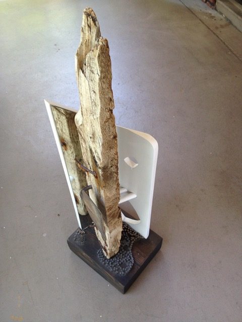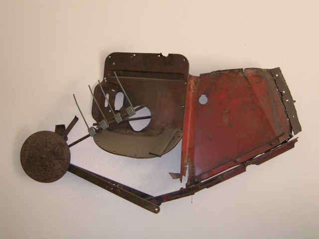 This piece was constructed of found objects, and was to in an abstract way, represent my favorite bird, the Kansas University mascot. It is presently residing in Hemet, CA